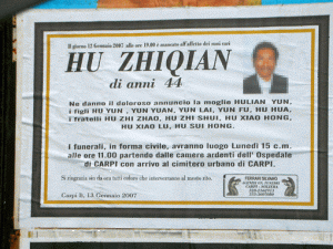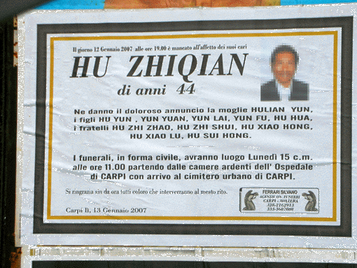 Mi sembra che i cinesi, normalmente, mettano il cognome davanti al nome. Comunque che strano, non avevo mai visto il manifestino funebre di un cinese in vita mia, non pensavo si facessero seppellire nei nostri cimiteri. Qua dalle nostre parti pare che si facciano rispedire in Cina, previo congruo pagamento, stipati in container.