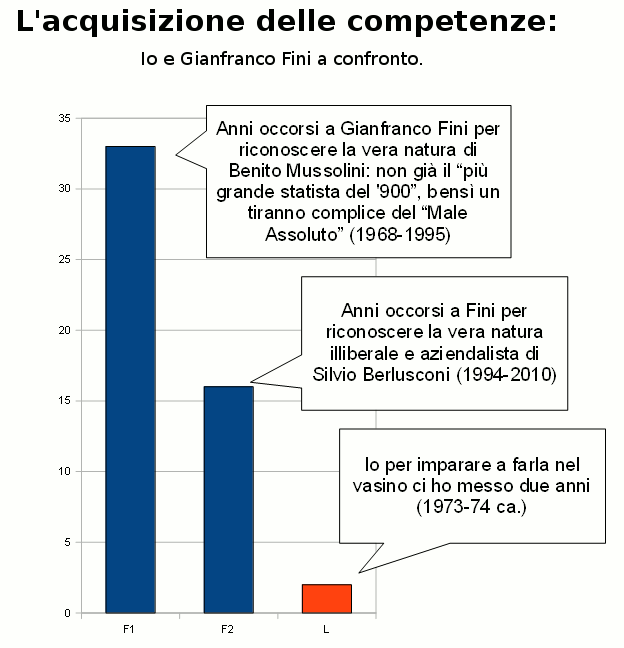 Be', direi che sta migliorando. F2 è meno della metà di F1. Quindi ogni circa vent'anni Fini dimezza il tempo che gli occorre per comprendere la vera natura della sua stella politica di riferimento. Di questo passo, fra vent'anni potrebbe quasi farlo in tempo reale.