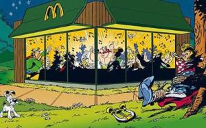 Immaginatevi un Topolino convertitosi al nazismo, o uno zio Paperone che scopra il Capitale di Marx e trasformi il suo deposito in una Cassa Operaia di Mutuo Soccorso. Il cartellone pubblicitario che raffigura un banchetto degli Irriducibili non più sotto le stelle, ma sotto il tetto a pagoda di un McDonald’s, è uno choc del genere. Sin dal loro arrivo nelle edicole francesi, 51 anni fa, i Galli di Goscinny e Uderzo hanno incarnato l’orgoglio dei francesi, la loro “irriducibilità” nei confronti dei costumi e delle mode che arrivavano da fuori – in primis, dall’America.