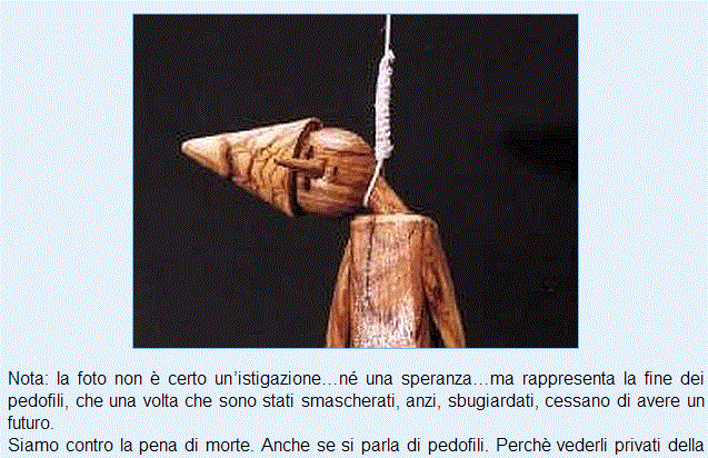 Ora, secondo me Frassi, quando dà conto di un processo a un catechista (la cui colpevolezza non è messa in dubbio nemmeno per un istante); quando avverte che “terremo il processo sotto stretta osservazione”, quando pubblica in calce l’immagine di un pinocchietto impiccato e ci fa notare che “la foto non è certo un’istigazione… né una speranza”… secondo me è in buona fede. Anche quando si premura di informarci che è contro la pena di morte, Frassi non percepisce nessuna contraddizione col pubblicare un cappio in homepage (che è comunque un grosso passo avanti rispetto a immagini assai più esplicite che pubblicava anni fa). Frassi non istiga al linciaggio, il suo pubblico devoto si indigna facilmente ma non uscirà mai nelle strade coi forconi. Frassi il linciaggio si limita a metterlo in scena. Impiccare i pinocchietti è una valvola di sfogo, il blog è una valvola di sfogo, è sempre stato così, un po’ per tutti, senz’altro anche per me.