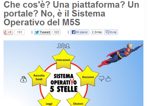 Magari è soltanto una coincidenza, ma due giorni fa ho chiesto da questo blog a Grillo e soci: la benedetta piattaforma per la politica duepuntozero, dov’è? Bene, ieri in primo piano su beppegrillo.it c’era un pezzo rivolto a certi “giornalisti pidimenoellini” che “o sono scemi o sono orbi”, visto che continuano a chiedere come va la piattaforma e non capiscono che “il Sistema Operativo del MoVimento 5 Stelle è in costruzione da due anni”. Per concludere con un enigmatico postscriptum: