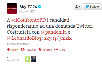 Da quel che ho capito funziona così: venerdì sera Sky Tg24 organizza il confronto tra i candidati alle primarie, che tanto bene funzionò l’anno scorso (anche perché lo trasmetteva in chiaro Cielo).