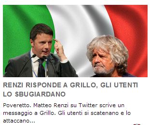Io non so se sia per imperizia dell’addetto ai fotomontaggi o per qualche astruso calcolo, fatto sta che in questa immagine Grillo è molto più buffo di Renzi – potrebbe benissimo essere un’immagine messa in giro dai comunicatori di Renzi, anche loro non esattamente campioni di raffinatezza. Comunque cliccando si finisce su un altro articolo di Tzetzé, una breve antologia di risposte a un acuminato tweet renziano (“I comici milionari dicono che 80 euro sono una presa in giro. Se provassero a vivere con 1200 euro al mese non lo direbbero“). Il tono più o meno lo dà la prima risposta: “rendendo un salario medioalto ti sei dimenticato cosa significa vivere cn 400 euro al mese. con 80 euro nn ci fai NIENTE!” Si può essere più o meno d’accordo, tranne con chi si lamenta che con 80 euro ci paghi giusto l’idraulico che ti ripara un rubinetto. Hai detto niente. O ti si rompe un rubinetto al mese?