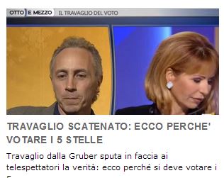 Ho visto il filmato per voi e posso tranquillizzarvi: Travaglio non sputa in faccia né ai telespettatori (e perché avrebbe dovuto, poveri telespettatori?) né a nessuno. Travaglio afferma pacatamente che gli italiani che votano 5 stelle “sperano di avere in Parlamento un’opposizione irriducibile fatta di persone che non hanno mai fatto politica e che vanno lì a fare le pulci ai professionisti della politica”; plaude ai giovani pentastellati nei consigli comunali che filmano gli inciuci. Non saprei dire quanti inciuci siano emersi negli ultimi anni grazie ai filmati dei giovani che non hanno mai fatto politica ma che evidentemente sanno fare le pulci, in ogni caso Travaglio la pensa così e lo dice – per ora – senza sputare.