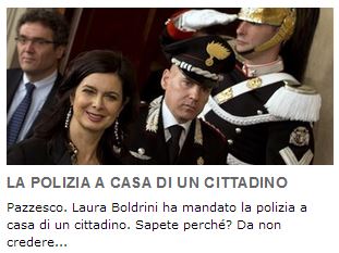 Non potendo saperlo, e non riuscendo a decifrare l’”ironia” e il “sarcasmo” del messaggio, la Boldrini avrebbe segnalato la cosa alla polizia. In realtà no: se si legge la notizia fino all’ultima riga, si scopre che “Laura Boldrini non c’entra, che non è lei e che lei nemmeno legge i commenti“; è la polizia a passare “al setaccio, con l’aiuto di un sistema computerizzato, le migliaia e migliaia di messaggi scritti sulla pagina del presidente della Camera”, e a selezionare tra i tanti il messaggio di un tizio di Termoli che – particolare non secondario – ha precedenti penali. Dunque, insomma, una notizia c’è: la polizia dà un’occhiata a chi commenta i messaggi della presidente della Camera, e magari li incrocia con il casellario giudiziale. Non dovrebbe farlo? Quanto ci costa? Non si potrebbe inserire un dispositivo che ci aiuti a riconoscere l’”ironia” e il “sarcasmo” nel messaggio di un 43enne con precedenti penali che minaccia la presidente di “fare un macello”? Potremmo aprire un dibattito. Ma prima torniamo un attimo allo strillo su beppegrillo.it, per favore. C’è scritto “Pazzesco, Laura Boldrini ha mandato la polizia a casa di un cittadino”. È vero? No, se leggi fino in fondo la notizia scopri che no: non è stata la Boldrini.