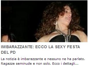 Donne seminude e non solo! Imbarazzi! Davvero incredibile che nessuno ne parli. Ma di cosa? Dunque (clic), pare che nel 2012 il gruppo dirigente del PD di Napoli invece di farsi vedere a Occupy Scampia sia andato a una festa che si chiamava “People party”, organizzata da Lorenzo Crea (capo ufficio stampa e portavoce del gruppo regionale del Partito democratico). Si trattava, secondo il sito casaleggiano TzeTzè, di un “party trash con ragazze seminude”. Wow. Ce le fa vedere? La tizia sgranata nella foto è forse un assaggio? No. Se clicchi sulla notizia, parte un video sulla Minetti. Giuro. Non è neanche un video in senso stretto, è una famosa intercettazione della Minetti con un fermo immagine della Minetti – seminuda, almeno? No, neanche. Ovviamente la Minetti non è del Pd, non parla né di Scampia né del People Party, insomma “i dettagli” un par di ciufoli. Ché io in linea di massima in questi giorni di vacche magrissime potrei anche capire la necessità di intercettare sempre di più il target dei guardoni annoiati da youporn, e tuttavia mi domando fino a che punto una strategia del genere funzioni: cioè quante volte lo puoi fregare un guardone cliccatore compulsivo? Quante volte gli puoi permettere “ragazze seminude e non solo” e poi mostrargli uno scatto stravisto della Minetti vestita? Quante, prima che ti mandi nel luogo tanto caro ai 5Stelle, Fanculo? Poi sicuramente Casaleggio è un genio della comunicazione e ha capito cose che io no; e tuttavia, boh.