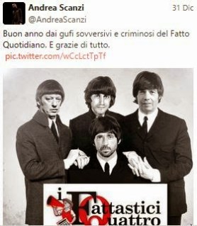 Dal 28 novembre lì in poi A.S. sarebbe stato sostituito da un bot – o dallo sforzo congiunto degli altri tre “fantastici” colleghi, che a dire il vero cominciano in punta di piedi, rimettendo a posto un suo intervento tv e virgolettandolo. Poi la necessità di non disilludere i fan scanziani li convince a pubblicare altri post a nome suo; magari anche qualche tirata antirenziana di repertorio nel cassetto da qualche settimana. Tutta roba che se non è già scritta, si scrive facile, e anche le immagini si possono riciclare. Verso la fine dell’anno gli impostori però cominciano a sentire il disagio della situazione e in un qualche modo (magari inconscio) cercano di avvisarci: Scanzi is Lost! Scanzi è come il Beatle farlocco!