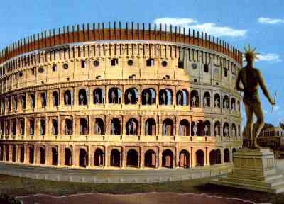 | Come doveva apparire, l’Anfiteatro Flavio, più massiccio e meno evocativo. All’inizio il “Colosso” era la grande statua di bronzo all’esterno (Nerone?) |