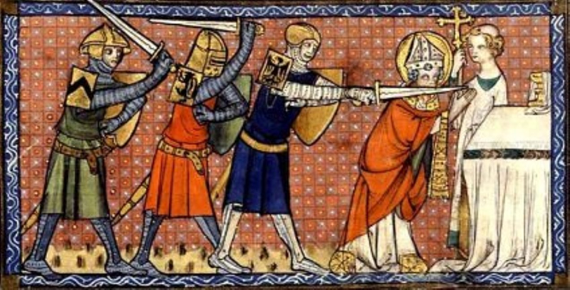 Proprio quando le parti stavano faticosamente arrivando a un compromesso, che conveniva a tutti, un evento esacerbò il già agro arcivescovo: Enrico decise di associare al trono il suo primogenito, proprio l’ex pupillo di Thomas: e chiamò a incoronarlo l’arcivescovo di York. Ora, da che mondo è mondo, i re d’Inghilterra li incorona l’arcivescovo di Canterbury. Thomas alla fine accettò di tornare sull’isola, ma quasi appena sbarcato mandò un triplo giro di scomuniche, ai vescovi di York, di Londra e di Salisbury, che erano stati presenti alla cerimonia. Questi fecero immediatamente appello al re, il quale, quando fu informato della tripla scomunica, si incazzò molto. Pronunciò in quell’occasione qualcosa di cui in seguito ebbe a pentirsi, anche se non sappiamo esattamente cosa. Ci sono varie versioni, diversi resoconti, perché il martirio di Thomas non è solo l’ultima leggenda del medioevo: è anche uno dei primi fatti di cronaca nera di risonanza europea, per mesi e anni nelle corti e nei chiostri non si parlò d’altro. Per il biografo ufficiale Enrico avrebbe detto: “Quali miserabili traditori ho allevato e cresciuto nella mia casa, che lasciano che il loro signore sia trattato così vergognosamente da un chierico di umili natali?” Ve lo immaginate un re incazzato del dodicesimo secolo che parla così? Diciamo che una frase tanto elaborata, ancorché verosimile in un contesto cortigiano, si presta male alla tesi della difesa, che sostiene che fu uno sbotto di collera: così nei secoli ha avuto più successo la teoria secondo cui Enrico disse semplicemente: “Nessuno mi libererà da questo prete turbolento?” Quattro cavalieri lo presero in parola e partirono immediatamente per Canterbury. Si chiamavano De Tracy, FitzUrse, Brito e Hugh de Morville, tutti e quattro cavalieri di alto lignaggio.