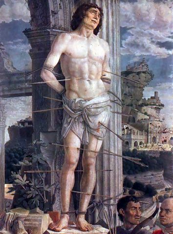 | Un San Sebastiano del Mantegna (1456), con un buffo nodo al perizoma. |