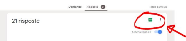 Ora dovete selezionare “Risposte”. Ci troverete statistiche, grafici e tante altre cose interessanti (ad esempio quali sono gli errori più frequenti), ma non c’è esattamente quello che state cercando voi, ovvero i punteggi dei vostri ragazzi. Per avere accesso a quelli dovete creare un foglio elettronico. Come si fa? Si preme il tasto apposta. Se usate Google Fogli avete già riconosciuto l’icona. Comunque è quello cerchiato in rosso qui sotto.