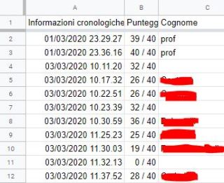 Il foglio è molto ampio ma le cose davvero interessanti sono tutte a sinistra: c’è l’orario in cui ogni ragazzo ha compilato il test e c’è il punteggio. Se il test è stato inviato per mail o raccoglie automaticamente la mail, dovrebbe esserci la mail di ogni ragazzo. Se invece la prima domanda del test è “qual è il tuo cognome”, dovrebbe esserci il cognome (ma se avete aggiunto la domanda all’ultimo momento può darsi che la colonna coi cognomi sia molto più a destra. Potete trasportarla a destra se siete pratici di fogli elettronici; anche se non lo siete: selezionate la colonna che v’interessa e trascinatela a sinistra col mouse).