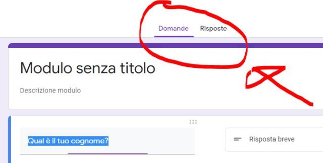 Giusto. Abbiamo aspettato un po’ perché magari nel frattempo qualche vostro studente ha iniziato a rispondere, e così possiamo osservare tutto dal vero. Ora, se ci fate caso, sopra il titolo del modulo (non del test prodotto dal modulo, mi raccomando), ci sono due ‘linguette’, “Domande” e “Risposte”. Il vostro modulo per ora è settato su “Domande”, come in questa immagine.