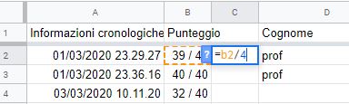 Nella casella C2 di questa colonna, inserirò la formula “=b2/4”, ovvero dammi il valore della casella b2 diviso per quattro. Perché diviso per quattro? Per il motivo che abbiamo detto sopra, ma ricordatevi: il divisore è sempre il massimo punteggio possibile diviso per dieci.