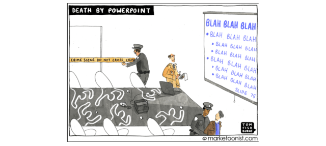 “Signori, siamo tutti qui riuniti per risolvere un problema: sembra che le presentazioni in powerpoint abbiano perso il loro mordente. Ovvero, sì, la gente continua a trovarle repellenti, ma l’effetto sorpresa del tipo “aaasrgh cos’è questa roba orribile” non c’è più, c’è stata una specie di assuefazione, e insomma, qualcuno ha un’idea?”