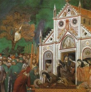 | Giotto: Pianto di Santa Chiara su Francesco morto. Non so la storia del tipo che monta sull’albero, ma un po’ mi ci riconosco: un impiccione che vorrebbe saperne di più senza averne il diritto. |