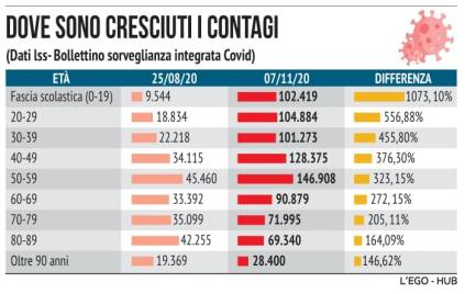 Io temo che Conte, e chi gli crede, per “dati” intenda appunto tabelle del genere, dove il contagio è diviso per fasce anagrafiche. Del resto è difficile pensare che esistano anche tabelle attendibili sul contagio diviso per ambienti nelle zone rosse: il tracciamento ormai è saltato. Il racconto quindi è questo: è vero, l’aumento del contagio tra i minori è stato notevole (spettacolare, aggiungerei), però continua a essere una piccola frazione del contagio complessivo: quindi i minori alla fine non si stanno contagiando tanto, dai, e quindi… le scuole non sono un focolaio. Ecco, Conte sta raccontando questa cosa. E a molti sta bene.