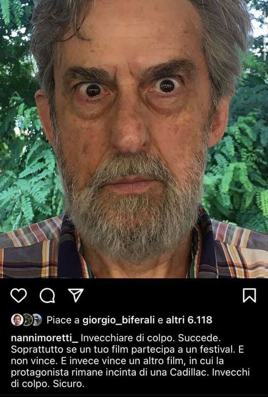 Questa immagine, ma soprattutto questa didascalia, divide l’internet italiana in due parti, e sospetto che la divisione azzecchi l’età mentale meglio dei documenti anagrafici. Non saprei tracciare un discrimine (nati nel 1980? 1985?) ma da un certo punto in poi è un’immagine imbarazzante: Ritratto di regista boomer che non capisce dove va il cinema. Probabilmente i giovani non fanno nemmeno caso ai capelli bianchi, che erano il punctum della composizione: Moretti era arrivato a Cannes con la chioma nera di ordinanza, il contrasto sempre più insostenibile col grigio cenere della barba. Quando sei un personaggio pubblico a un certo punto devi fare questa cosa di ammettere che ti tingevi i capelli, per quanto al di fuori possa sembrare ridicolo per alcuni è più traumatico di un coming out. In una botta sola devi ammettere che sei vecchio e che cercavi di nasconderlo. Se poi quasi nessuno ci fa caso è peggio ancora, significa che loro ti vedevano già vecchio: sei tu che ti aggrappavi al tuo autoritratto mentale, gli altri le tue rughe le danno per scontate, le vedono anche nei film dove ancora non le avevi.